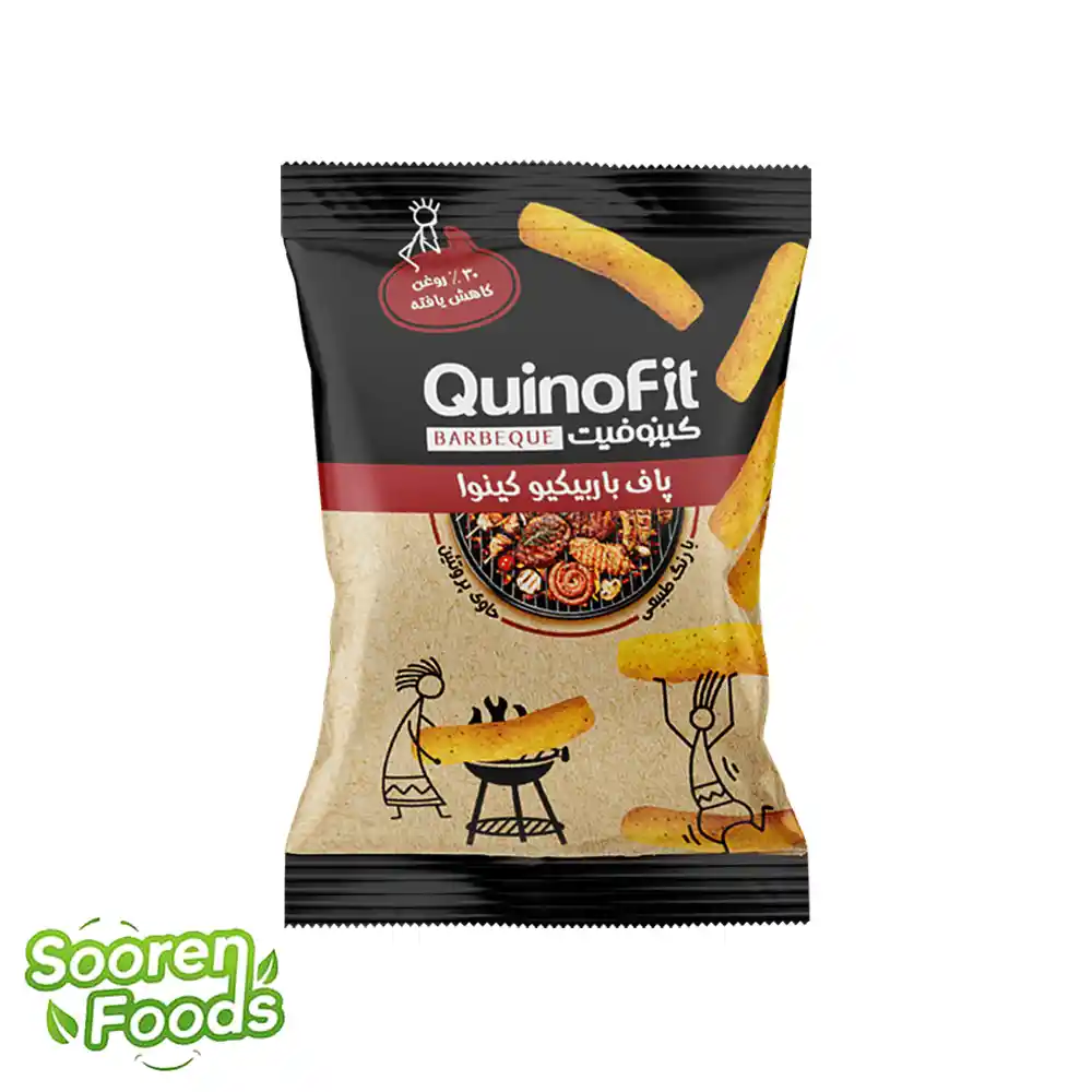 پاف باربیکیو کینوا کینوفیت | 50 گرم یک اسنک کینوا باربیکیو گیاهخواری و کمقند از برند معتبر quinofit است که با ترکیب کینوا، ادویه باربیکیو و بافتی پفدار، تجربهای متفاوت از اسنکهای روزمره ارائه میدهد.